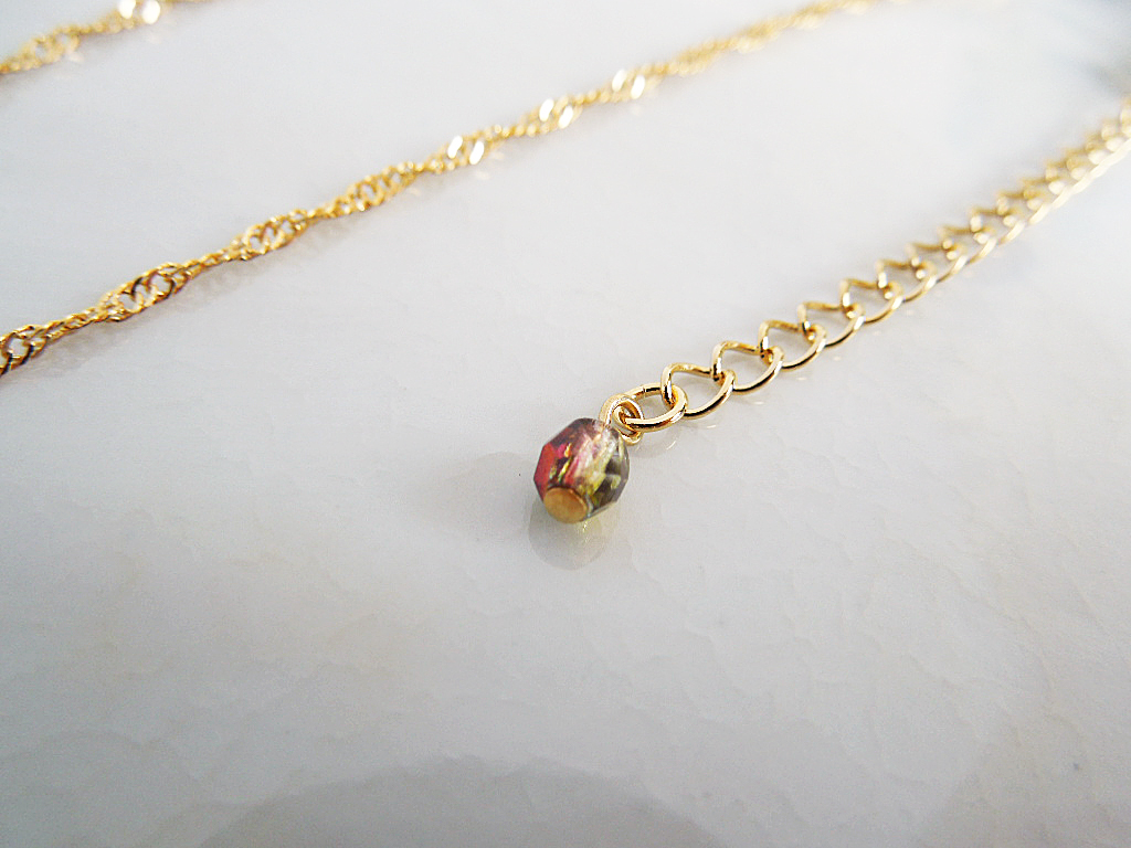 チェコビーズは、光の加減で、グリーン、レッド、ゴールド等